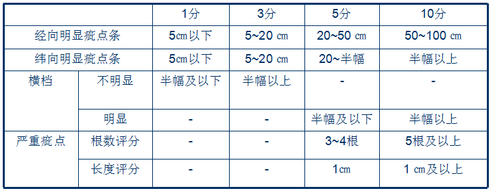 ●外觀質量檢驗主要是表麵疵點(疵點數/匹、米/疵點、碼/疵點)。