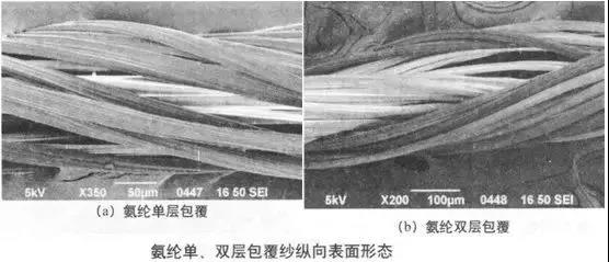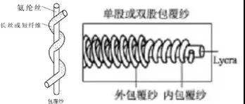 單包覆紗 是在芯絲氨綸外層包上一層外包絲(紗),圈數較少,織物露芯較明顯,不適宜作深色產品。主要用於襪子、緯編內衣等彈力織物。