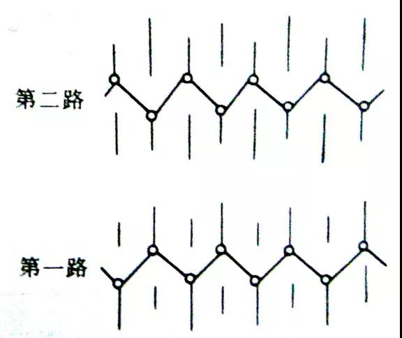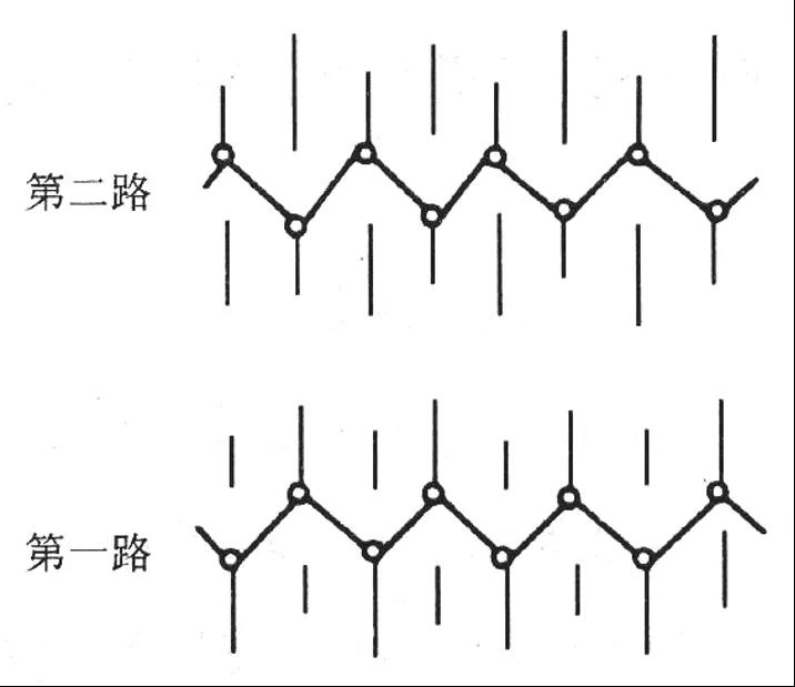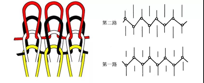 (2)一個線圈橫列由相鄰兩個成圈係統形成(兩根紗線),因此同一橫列上相鄰線圈在縱向彼此相差半個圈高。
