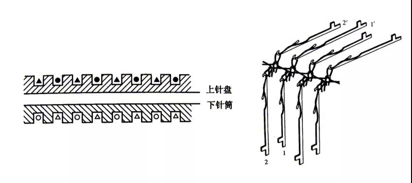 雙羅紋組織由兩根紗線形成一個線圈橫列,一根紗線編織時,下針筒的奇數針和上針盤的偶數針相配合形成一個1+1羅紋;另一根紗線編織時,下針筒的偶數針與上針盤的奇數針相配合形成另一個1+1羅紋。互鎖形成雙羅紋組織。