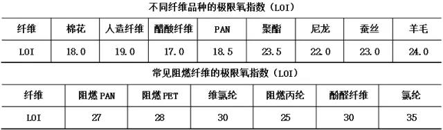 與火源接觸後,纖維不能燃燒(如玻璃纖維),或燃燒反應不充分,僅有較小火焰燃燒(如氯綸),火源撤走後,火焰能較快地自行熄滅的纖維都可稱作阻燃纖維。根據纖維的極限氧指數(LOI)值,一般認為氧指數<22屬於易燃材料,氧指數在22~27之間屬可燃材料,氧指數>27屬難燃材料。常見合成纖維和阻燃纖維的LOI如下表所示。