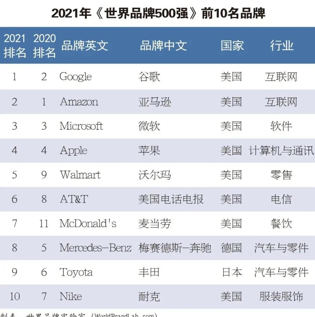 憑借優異的市場表現及強勁的業務增長,去年的亞軍穀歌(Google)一舉擊敗亞馬遜(Amazon)榮登榜首;亞馬遜因受疫情影響業績不及預期,退居第二;2021財年淨利潤大增的微軟(Microsoft)繼續保持第三。美國占據500強中的198席,穩居品牌大國第一。法國、日本、中國和英國為世界品牌大國的第二陣營。中國品牌入選數(44個)超越英國(37個),繼續保持第四名的好成績。
