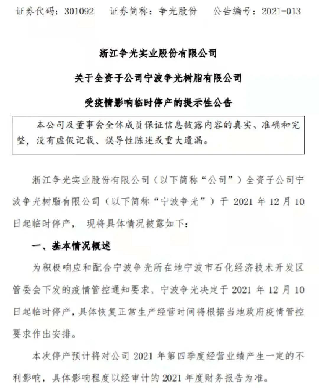 12月9riwanjian,zhengguanggufenfabugonggaocheng,weijijixiangyinghepeihesuozaidiningboshishihuajingjijishukaifaquguanweihuixiafadeyiqingguankongtongzhiyaoqiu,gongsiquanzizigongsiningbozhengguangshuzhiyouxiangongsijuedingyu2021年12月10日起臨時停產,具體恢複正常生產經營時間將根據當地政府疫情管控要求作出安排。本次停產預計將對公司2021年第四季度經營業績產生一定的不利影響。