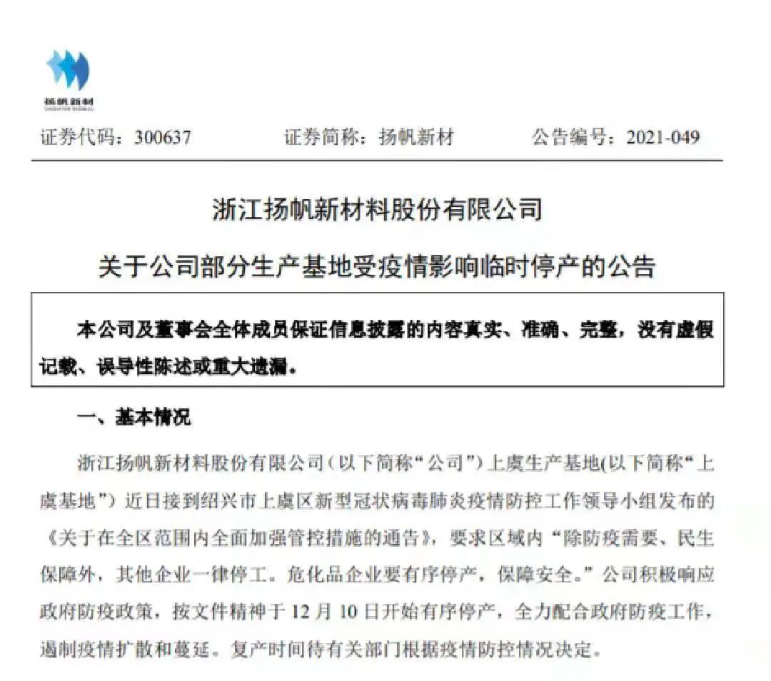 12月10日早間,揚帆新材發布公告稱,公司上虞生產基地(“上虞基地”)近日接到紹興市上虞區加強管控措施的通知,要求區域內“除防疫需要、民生保障外,其他企業一律停工。危化品企業要有序停產,保障安全。”公司積極響應政府防疫政策,按文件精神於12月10日開始有序停產,複產時間待有關部門根據疫情防控情況決定。