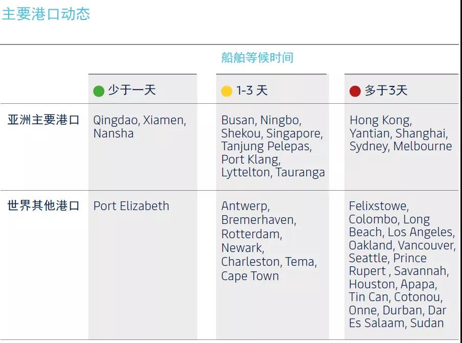 根據馬士基最新的亞太區供應鏈市場趨勢報告(2021年11月),全球主要港口動態如下表: