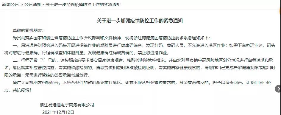 12月12日ri,受shou疫yi情qing升sheng級ji影ying響xiang,寧ning波bo舟zhou山shan港gang發fa布bu了le關guan於yu進jin一yi步bu加jia強qiang疫yi情qing防fang控kong工gong作zuo的de緊jin急ji通tong知zhi,將jiang對dui預yu約yue進jin入ru碼ma頭tou開kai展zhan進jin提ti箱xiang作zuo業ye的de駕jia駛shi員yuan進jin行xing健jian康kang碼ma篩shai查zha。
