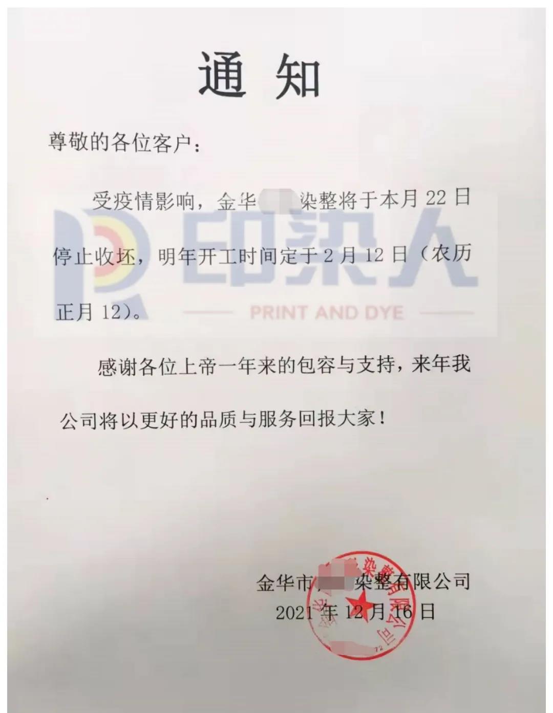12月16日,浙江金華某染整公司發出通知,自12月22日停止收胚,明年開工時候定於2022年2月12日。