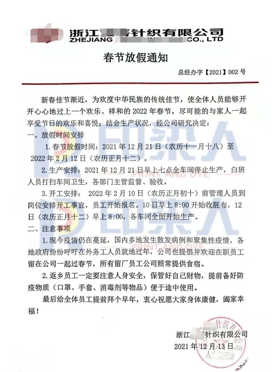 12月15日,廣東中山某染整處理公司發布2022年元旦、春節放假通知,其中春節放假時間自2022年1月17日至2月16日。