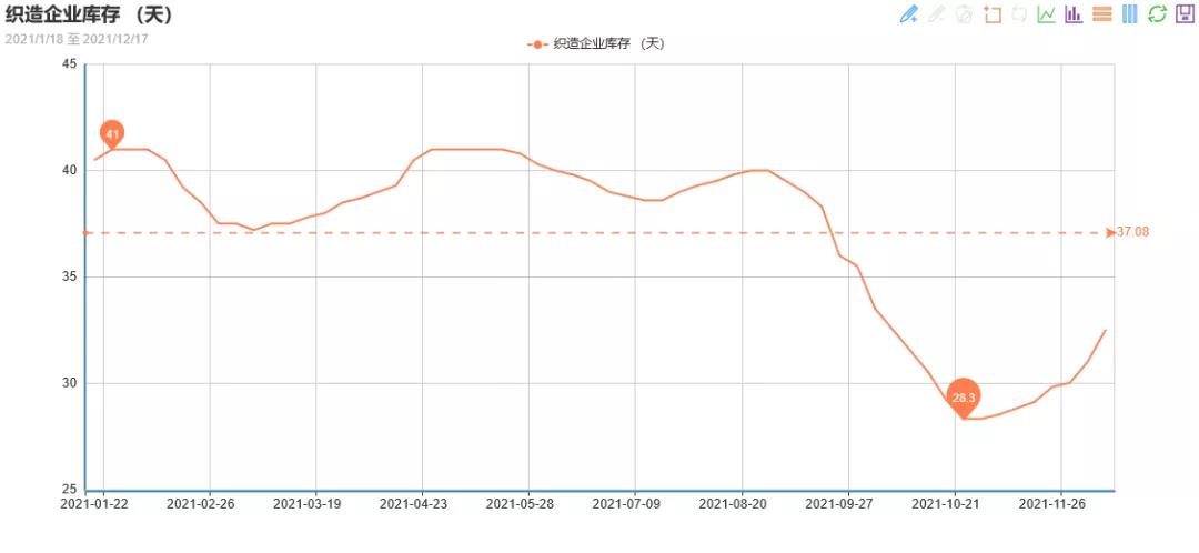 另(ling)一(yi)方(fang)麵(mian),近(jin)期(qi)由(you)於(yu)浙(zhe)江(jiang)疫(yi)情(qing)及(ji)年(nian)底(di)需(xu)求(qiu)較(jiao)差(cha),市(shi)場(chang)傳(chuan)言(yan)今(jin)年(nian)紡(fang)織(zhi)廠(chang)的(de)放(fang)假(jia)時(shi)間(jian)可(ke)能(neng)會(hui)出(chu)現(xian)提(ti)前(qian)的(de)情(qing)況(kuang)。目(mu)前(qian)織(zhi)造(zao)廠(chang)家(jia)的(de)庫(ku)存(cun)正(zheng)處(chu)於(yu)上(shang)升(sheng)階(jie)段(duan),據(ju)綢(chou)都(dou)網(wang)數(shu)據(ju)監(jian)測(ce)顯(xian)示(shi),目(mu)前(qian)織(zhi)造(zao)廠(chang)家(jia)的(de)庫(ku)存(cun)在(zai)32.5天左右,較11月上升4天。另外江浙多地紡織廠及貿易商反饋,近一周多來常規坯布詢價和出貨仍沒有多大起色,成交價明顯回落,部分廠家調整幅度超過20%。同時原料價格也以小幅陰跌為主。