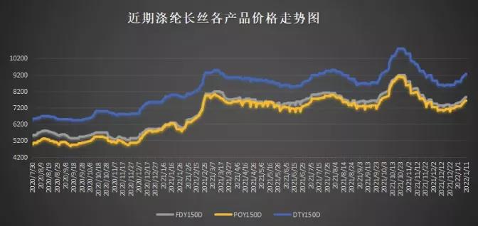 目前上遊滌絲價格在1月份以來出現了明顯的一波上漲並持續至今。在國際油價上漲的帶動下,聚酯原料PTA、滌綸長絲價格持續走高。滌綸長絲已經持續13連漲,POY150D從6975元/噸漲至7780元/噸,漲幅達11.54%;DTY150D從8550元/噸上漲至9350元/噸,漲幅為9.36%;FDY150D從7200元/噸上漲至8000元/噸,漲幅為11.11%。