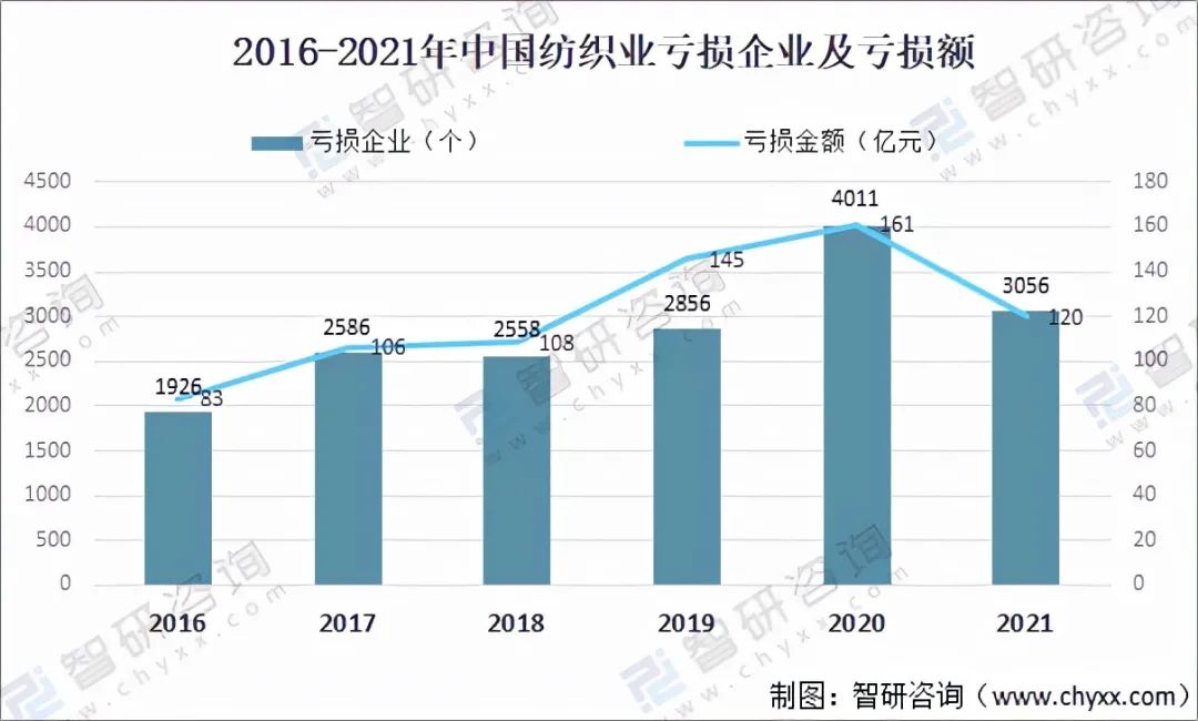 2021年中國紡織業虧損企業相比2020年減少955個,同比下降23.8%;中國紡織業虧損金額為120億元,同比下降25.6%。
