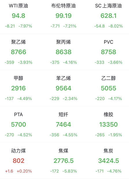 國內能源化工市場,也是慘不忍睹!上海原油跌超6%,PP、PE、甲醇跌超2%,PVC跌1.69%,苯乙烯跌1.06%,自上而下的,原油帶著各大衍生化工品一起跌!