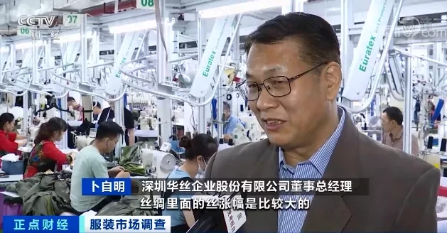 卜自明說道:我們主要做絲綢,絲綢裏麵的絲漲幅比較大,從去年年底的40萬一噸,現在已經超過50萬一噸,幅度差不多30%左右,比如化纖裏麵的彈力絲氨綸,現在漲價幅度很厲害,漲了兩三倍。