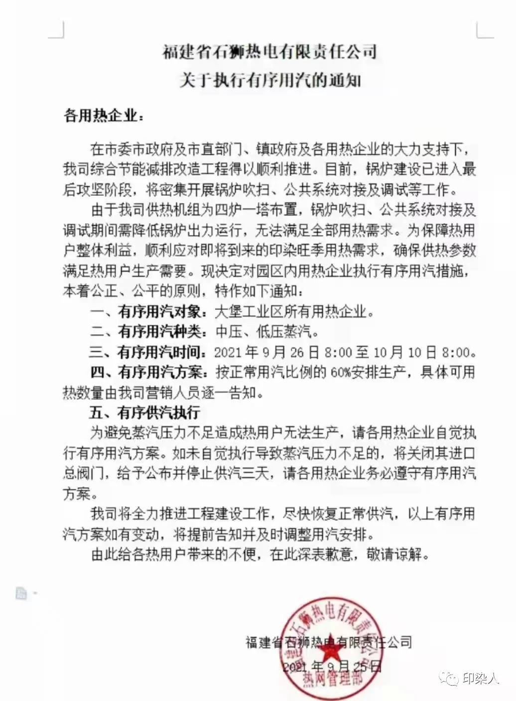 9月25日,福建省石獅市熱電有限責任公司發布《關於執行有序用汽的通知》。將對石獅大堡工業區所有用熱企業實行有序供汽,時間期限從2021年9月26