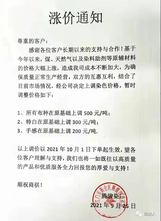 紡織印染生產地,也有印染企業實在受不了生產成本的高漲發出染費調整的通知。來看市場最新消息。