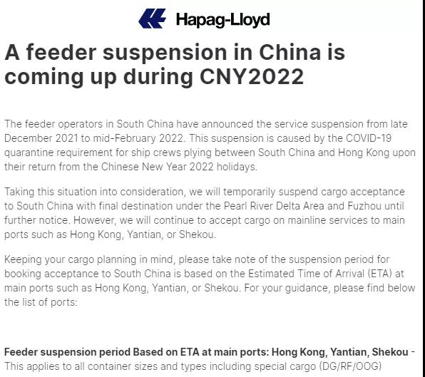 繼23日ONE發布公告暫停接收經華南地區主要港口再通過國內支線到達最終目的地的貨物後,26日晚,赫伯羅特官網也發布公告,由於在2022年春節假期結束後,往返華南和香港的船員需要接受新冠肺炎檢疫。華南支線運營商已宣布從2021年12月底至2022年2月中旬暫停服務。