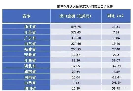 而不容忽視的是,今年以來,在江浙地區服裝出口迎來穩步增長的同時,中西部省市出口表現卻異常突出。據測算,1-9月,我國西部地區出口紡織品服裝123.7億美元,同比增長23.9%,占我國紡織品服裝出口市場的5.4%;