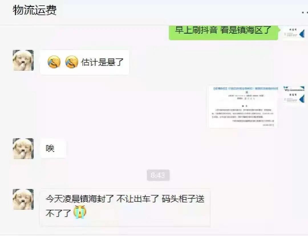 有物流公司表示,“鎮海封掉之後不讓出車,碼頭櫃子也送不了了,本來在截單的訂單也不能提櫃裝箱,現在都在等通知。”