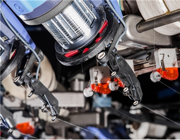 不論是針筒與針盤同步回轉而三角座固定的羅紋機,還是三角座回轉而針筒與針盤固定的羅紋機,都從導紗器引入紗線,由針筒舌針形成正麵線圈,針盤舌針形成反麵線圈。一根紗線在緯向交替編織正反麵線圈,以形成羅紋組織。