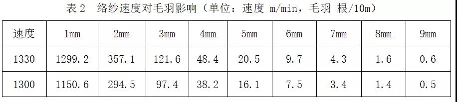 品種:陽離子滌綸T/R 65/35 18.4tex,試驗條件:YG172A紗線毛羽測試儀,測試速度:30m/min,測試長度:60m,絡筒速度:1300m/min2.2.6.1 做好優化工藝控製自絡毛羽增長的試驗(1)優選絡筒速度和絡紗張力,自動絡筒機絡紗張力、絡luo紗sha速su度du對dui毛mao羽yu有you很hen大da的de影ying響xiang。絡luo紗sha速su度du和he絡luo紗sha張zhang力li在zai工gong藝yi調tiao整zheng時shi應ying看kan做zuo一yi個ge整zheng體ti進jin行xing,如ru果guo僅jin考kao慮lv一yi個ge工gong藝yi參can數shu會hui適shi得de其qi反fan,具ju體ti優you選xuan時shi相xiang互hu結jie合he,可ke以yi做zuo到dao高gao速su運yun行xing毛mao羽yu增zeng長chang幅fu度du不bu大da的de效xiao果guo。絡luo紗sha速su度du對dui毛mao羽yu影ying響xiang見jian表biao2。
