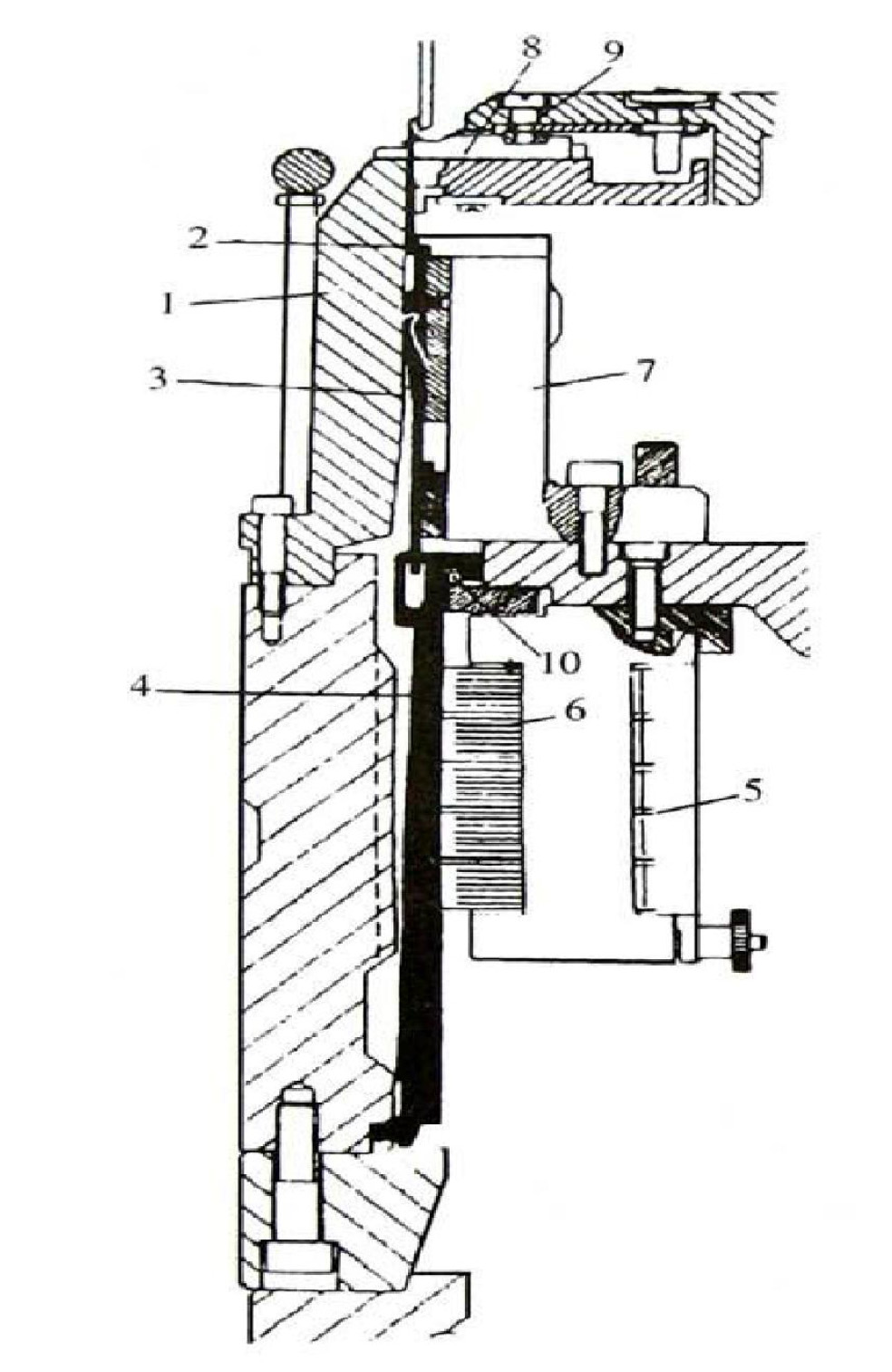 落地紗架上的紗筒經一係列導紗鉤(改變方向)——半儲存式給紗裝置——編織區域。其中,半儲存式給紗裝置為消極式結紗裝置(如圖4-1),紗線1經張力裝置2、斷紗自停探杆3(斷紗時指示燈8閃亮),切向卷繞在儲紗筒10上。儲紗筒由內裝的微型電動機(老式)或條帶(新式)驅動。當傾斜配置的圓環4處於最高位置時,它使控製電動機的微型開關接通,或使控製條帶與儲紗筒接觸的電磁離合器通電,從而電動機(或條帶)驅動儲紗筒回轉進行卷繞。由於圓環4的傾斜,卷繞過程中紗線被推向圓環的最低位置。當儲紗筒上的卷繞紗圖數達最大時(約4-5圈),圓環4使電動機開關斷開或電磁離合器斷電,因此,儲紗筒停止卷繞。