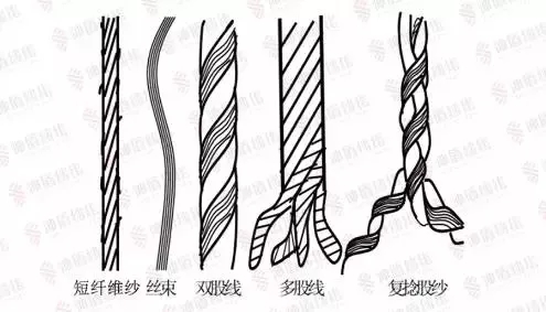 單紗、股線、單絲、複絲、膨體紗、變形紗、包芯紗、花式紗線、竹節紗、無撚紗、包纏紗等。