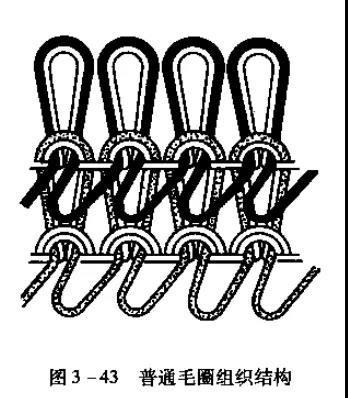 毛圈組織是由平針線圈和帶有拉長沉降弧的毛圈線圈組合而成。一般由兩根紗線編織。一根紗線編織地組織,另一根紗線編織帶有毛圈的線圈。毛圈組織可分為普通毛圈組織和花色毛圈組織兩類,同時還有單麵和雙麵之分。在普通毛圈組織中,每一隻毛圈線圈的沉陣弧都形成毛圈而在花色毛圈組織中,毛圈是按照圖案花紋,僅在一部分線圈中形成。單麵毛圈組織僅在織物工藝反麵形成毛圈,而雙麵毛圈組織則在織物的正反麵都形成毛圈。