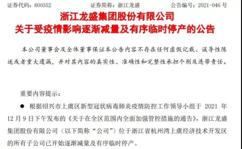 12月10日晚間,A股上市公司浙江龍盛(600352.SH)、皇馬科技(603181.SH)和貝斯美(300796.SZ)接連公告,為積極響應和配合疫情管控要求,旗下位於浙江紹興上虞區的多家子公司臨時停工停產。