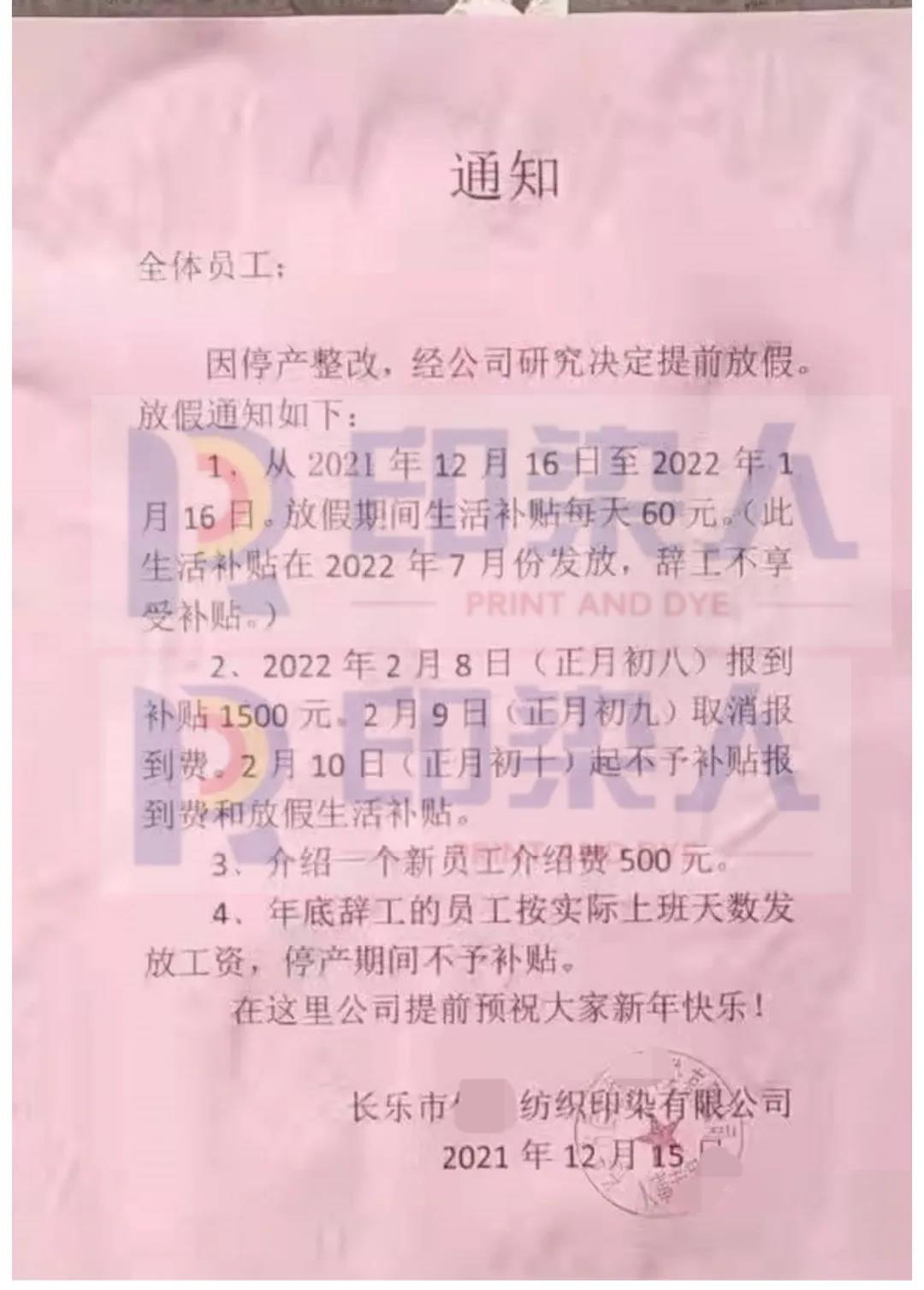 印染人從渠道獲悉,福建長樂某印染廠因停產原因,自12月16日開始放假,2022年2月8日員工報道,並對放假期間補助進行詳細說明。