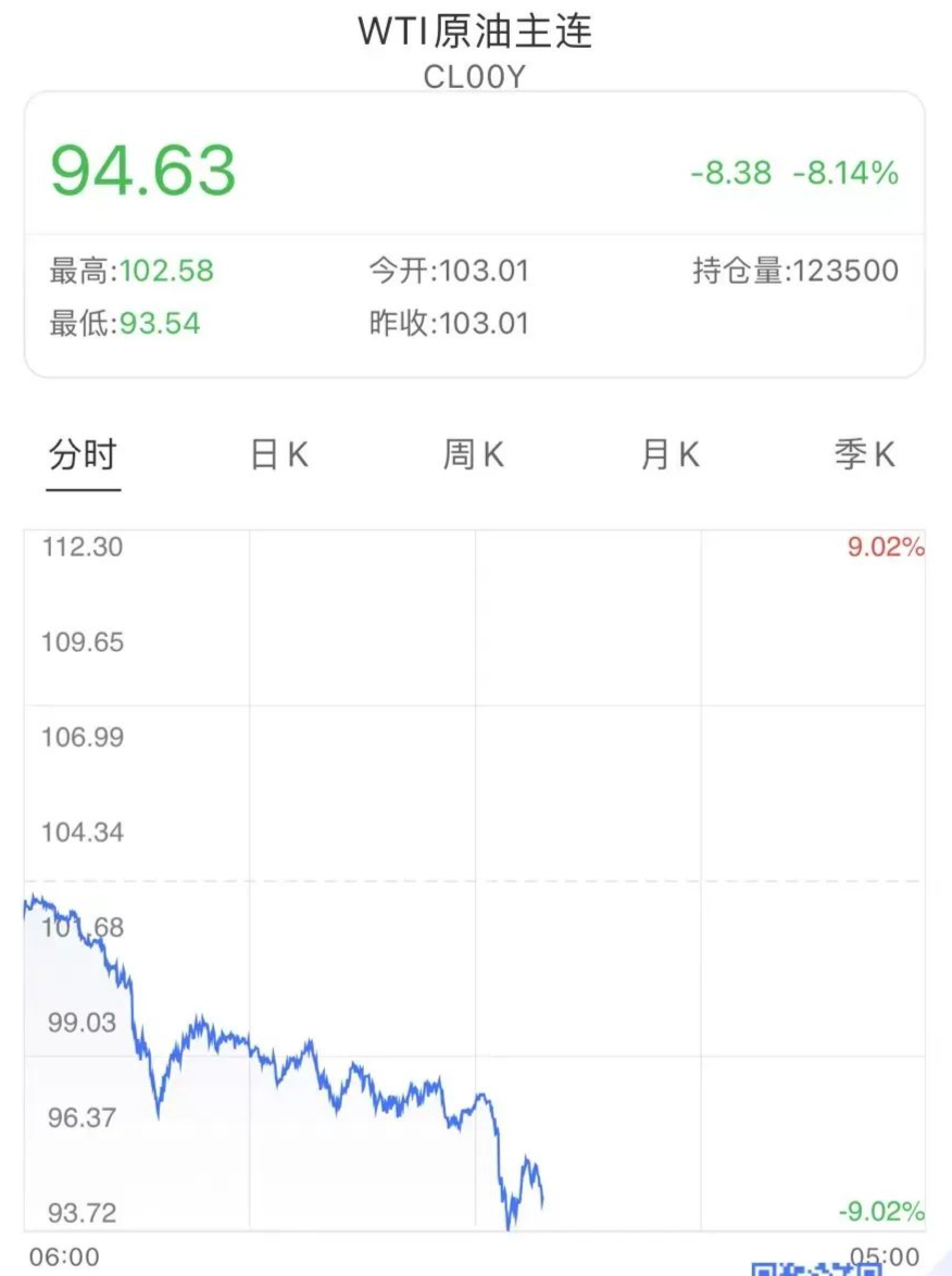 截至發稿,布油價格大跌7.85%至98.51美元/桶,3月1日以來首次盤中跌穿100美元/桶,較月高回落近40美元;WTI原油價格跌8.31%至94.45美元/桶,周一,該品種價格就已失守100美元大關。