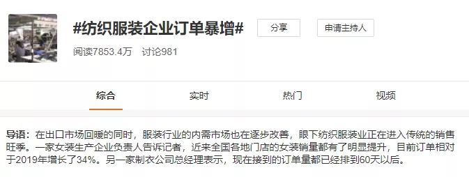 受內需市場驅動,疊加海外訂單回流,我國紡織業經營情況好轉,營收穩步增長。國家統計局的數據顯示,2021年1-6月,我國服裝行業規模以上企業12467家,累計實現營業收入6534億元,同比增長12.99%;利潤總額274億元,同比增長13.87%;服裝產量113.23億件,同比增長19.98%。也有別的紡織人表達出了自己。