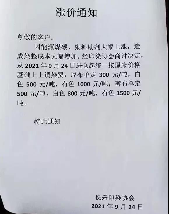 紡織印染生產地,也有印染企業實在受不了生產成本的高漲發出染費調整的通知。來看市場最新消息。