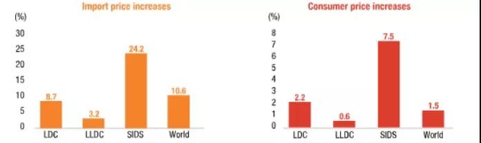 小島嶼發展中國家(SIDS)受到的影響最大,海運成本飆升將令其消費者價格上漲7.5個百分點。內陸發展中國家(LLDC)消費者價格可能上漲0.6%。