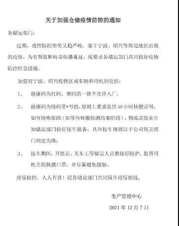 近期,疫情防控形勢又趨嚴峻。鑒於寧波、紹興等周邊地區出現的疫情,為有效阻斷病毒傳播蔓延,現要求各儲運部門共同做好疫情防控應急措施。