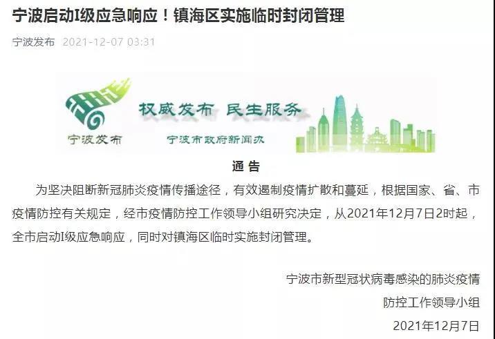 12月7日淩晨,“寧波發布”官方發布通知稱,從2021年12月7日2時起,寧波全市啟動I級應急響應,同時對鎮海區臨時實施封閉管理。