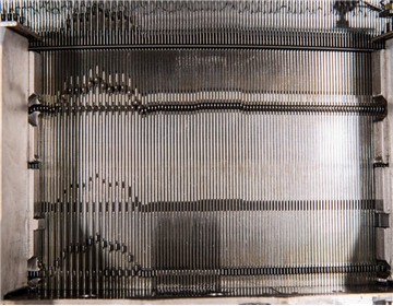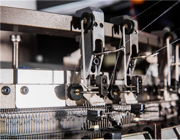 不論是針筒與針盤同步回轉而三角座固定的羅紋機,還是三角座回轉而針筒與針盤固定的羅紋機,都從導紗器引入紗線,由針筒舌針形成正麵線圈,針盤舌針形成反麵線圈。一根紗線在緯向交替編織正反麵線圈,以形成羅紋組織。